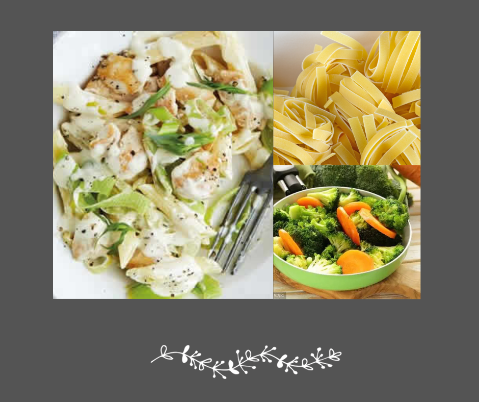 Poulet tendre en lanières sauté avec des poireaux fondants, servi sur des fettuccini et accompagné de légumes du moment.